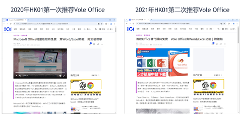 Awards & Recognitions奖项与认可 Vole Office was recommended twice by Hong Kong's largest Chinese website, Hong Kong 01.com, in 2020 and 2021 as a perfect alternative to Microsoft Office. Vole Office 在2020年和2021年两次被香港最大的中文网,香港01网推荐为微软Office完美替代。